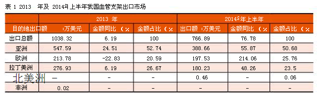 2014年上半年,我国血管支架总计出口约为766.89万美元,同比大幅增长76.78%,亚洲依然为我国最大的出口市场,上半年出口388.66万美元,同比增长55.87%,占全部出口的50.68%;其次对欧洲出口197.53万美元,同比增长214.06%,金额占比约为25.76%;对拉丁美洲出口180万美元,金额同比增长48.26%,占比约为23.5%(表1)。
